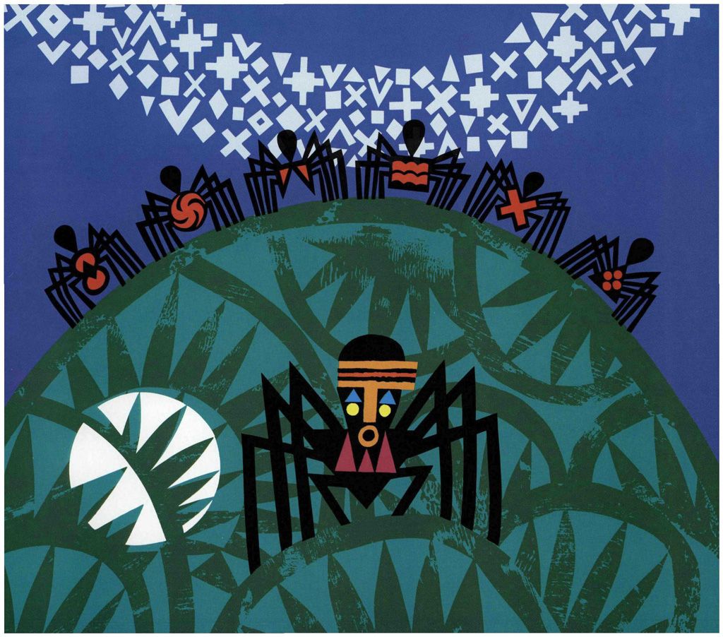 Anansi is an important character in West African and Caribbean folklore, originating from the Akan people of what is now called Ghana (or so my Googling informs me). In Gerald McDermott's Caldecott medal-winning adaptation of one of the Anansi stories, we learn about how the moon came to be in the sky.