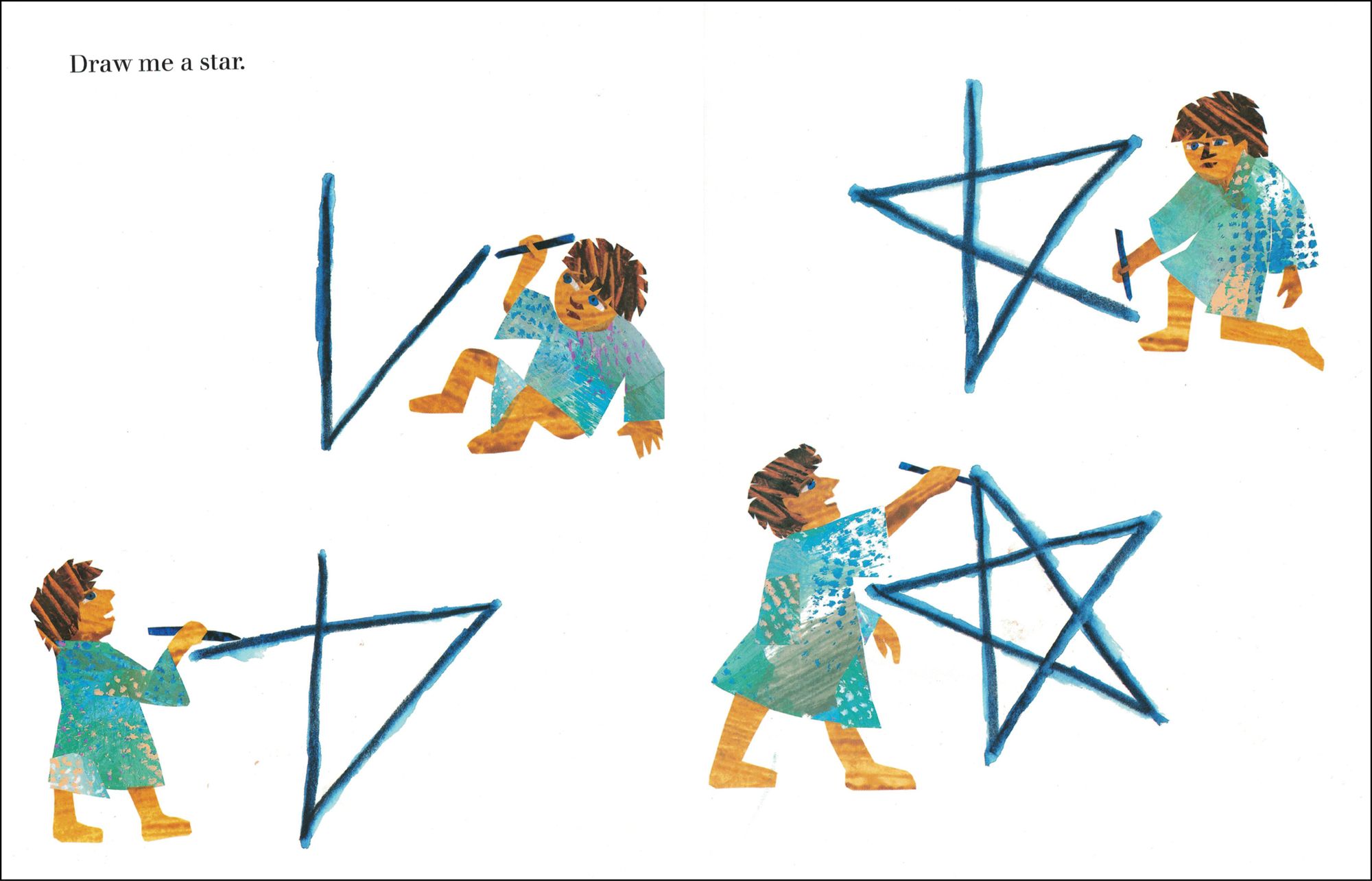 My favorite thing about this book is that it begins with the artist drawing a star, and ends with him drawing a star. All the steps are shown discretely, and the eight-pointed star at the end has an accompanying poem that breaks the task into beats ("1. Down, / 2. over, / 3. left, / 4. and right, / 5. draw / 6. a star / 7. oh so / 8. bright."). Learning to draw a star is a useful skill, and this is the perfect book to help foster an interest in mastering it.