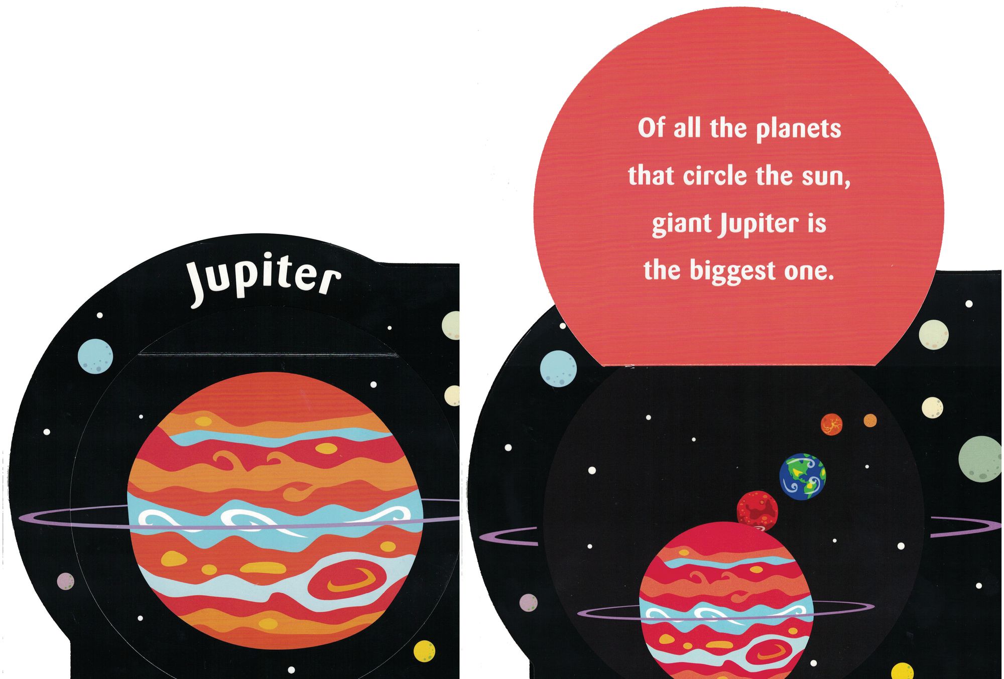 With simple rhyming text, we visit the eight planets that revolve around our sun, one at a time. Each planet is revealed by opening a large flap, which provides fun interaction (although easy to tear, too). A single line of rhyming text provides an accurate and easy bite of information about what makes each planet unique.