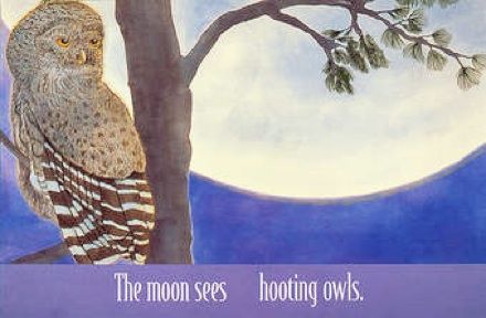 The type is very large and the sentences are quite simple, making this a wonderful book for print awareness or for a group read aloud. There is a beautiful symmetry to the book, too. The sun sees "blue skies," "sleeping owls," "crowded barnyards," "bustling streets," "noisy playgrounds," "rolling meadows," and "busy children." The moon sees "bright stars," "quiet barnyards," "hooting owls," "empty streets," "silent playgrounds," and "sleeping children."