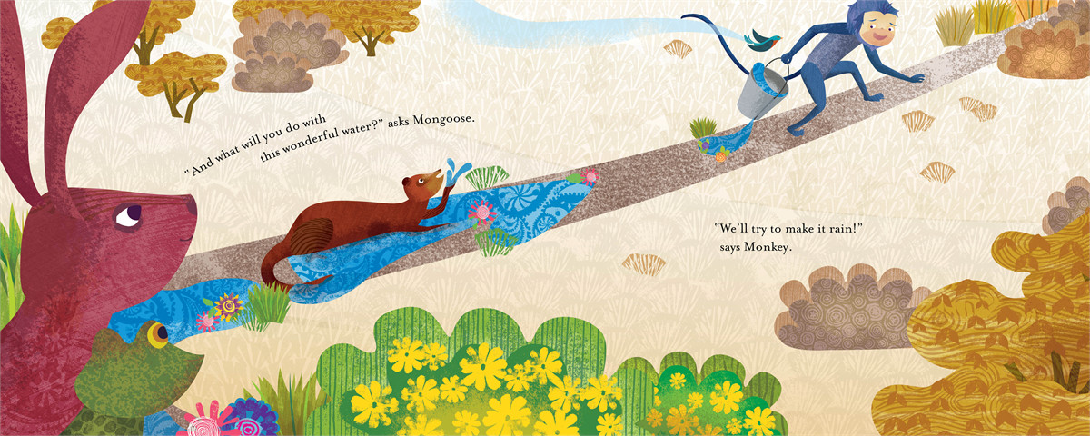 I particularly like that the approach the authors took here was to have each animal ask a question of Monkey that sequences the plot: 1. “Where did you find this wonderful water?” asked Toad. “Hidden inside a cave!” says Monkey; 2. “And where are you taking this wonderful water?” asks Rabbit. “Back up the mountain to Peacock!” says Monkey; and 3. “And what will you do with the wonderful water?” asks Mongoose. “We’ll try to make it rain!” says Monkey. (1) is what just happened, (2) is what is happening now, and (3) is what is next. Sequencing is such a difficult skill, and this is imbedded quite nicely. It’s truly wonderful practice.