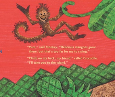 The best thing about this book is the art. Crocodile and Monkey are beautifully constructed using collages of cut and torn papers. The colors are bright and warm and contrasting. Best of all, the movements and emotions of the characters are well realized. It’s completely possible to tell this story just based on the pictures—and this is the mark of a very good narrative picture book for my kids, for whom language can be so challenging.