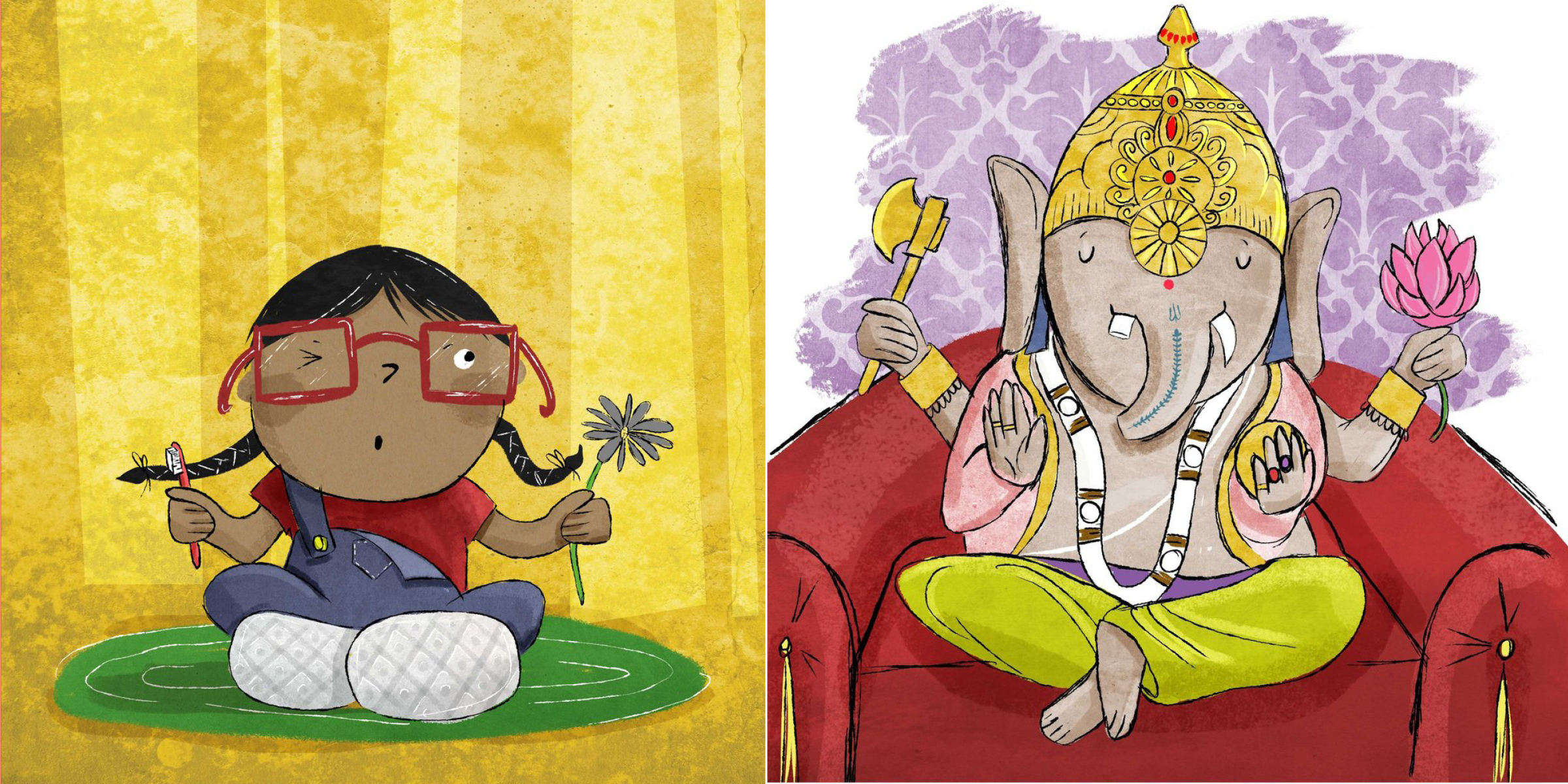 But even though the words are sparse, that one single sentence introduces two very tricky demands on a child: the name of the god (likely unfamiliar) and an abstract attribute that makes that god powerful. What I mean by “abstract” is that it’s not that Ganesh is big or has an elephant’s head that is mentioned—it’s that he’s "wise.” The list of attributes the book uses are: “wise,” “creative,” “full of energy,” “generous and kind,” “can focus,” “creates,” and “can protect what she creates.”