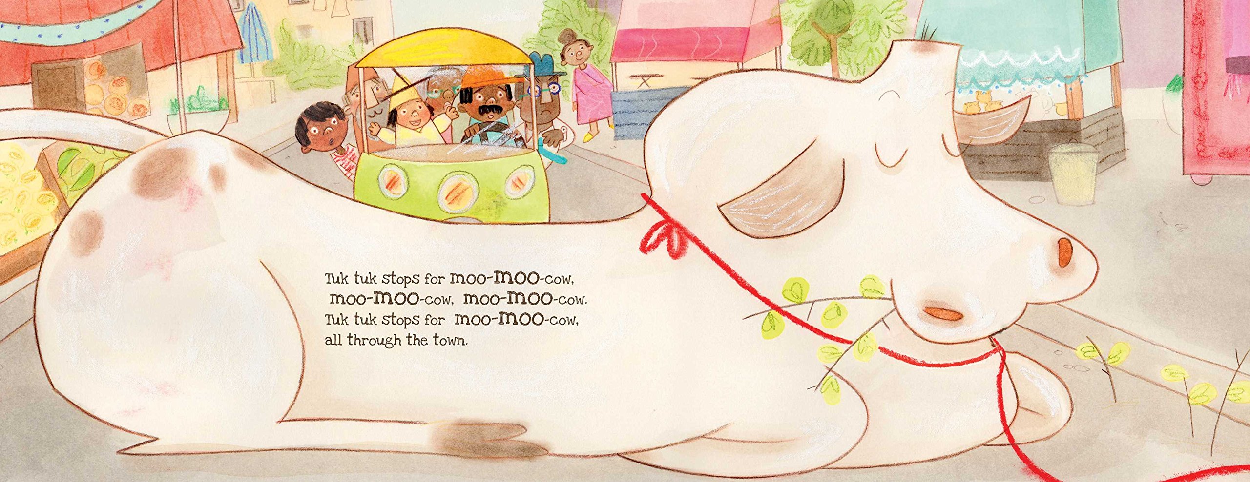The Wheels on the Tuk Tuk brilliantly centers an exploration of an Indian town around the familiar nursery song, “The Wheels on the Bus,” instantly communicating with "Tuk Tuk wheels go round and round" that the tuk tuk is equivalent to a city bus. This basis for comparison is cemented a few pages later when the "Rupees on the bus go ching ching ching."