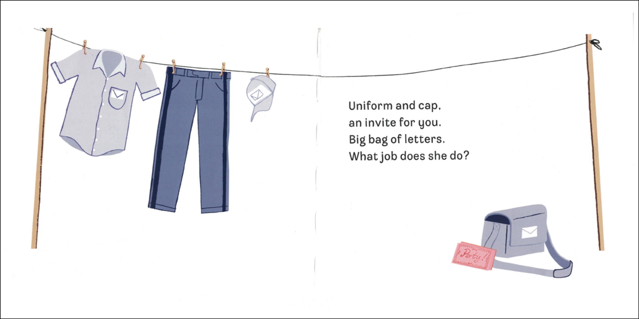 My kids love guessing game picture books! This one is about matching clothing to the kind of job it is worn for. First we see a clothesline with clothes associated with a particular job (along with a few accessories to provide extra clues). When we turn the page, we are told the answer, and we see the worker doing the job in their community. These scenes are often quite busy with lots of details, but the empty white background helps a lot. There is also a welcome diversity of gender and ethnic representations.