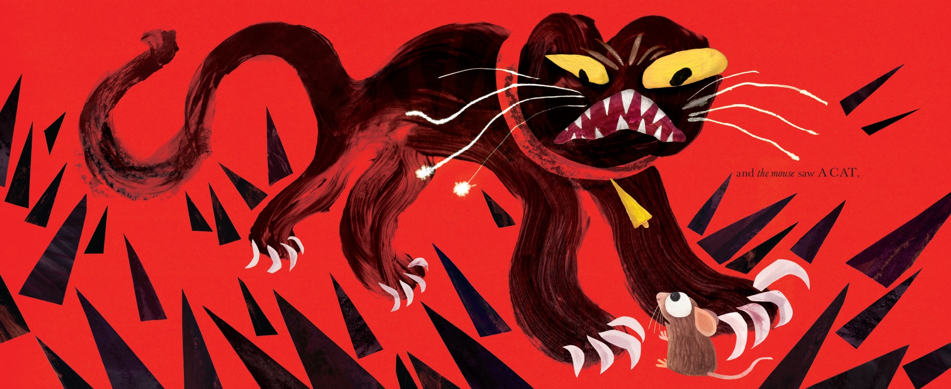 This is an almost perfect book. It is unnecessarily complex in parts—including days of the week for no reason, and not sticking to a uniform syntax. But the plot is repetitive, the collage art pops wonderfully against a solid black background, and the use of color to show what the mice are imagining (the tail becomes a blue rope when Blue Mouse guesses the Something is a rope, for instance) is extremely clever.