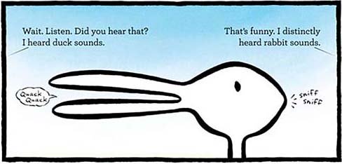Because the illustrations shift to give context to the differing perspectives, kids should easily see how the drawing can be seen as both a duck and a rabbit. I love how Duck! Rabbit! demonstrates how our perceptions can shift. And indeed, in that spirit, the people arguing in the book switch sides in the final pages as they begin to see the other person's point.