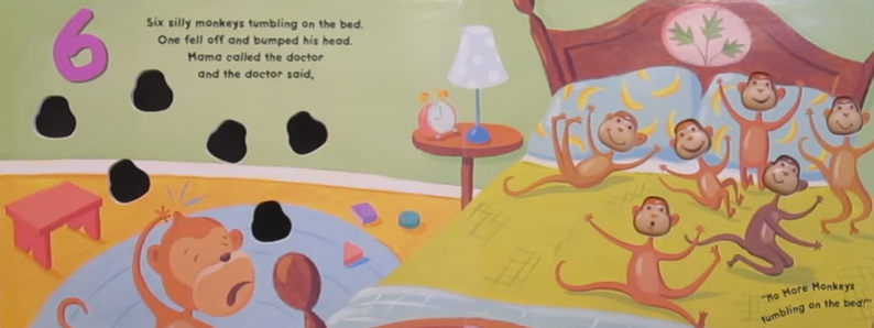 One quibble: I love the illustrations. I think they are bright and cheerful and decent at showing the actions that are named. But the math is just terrible. There are always the correct number of monkeys on the bed (pre-fall), but there are also monkeys from prior verses with boo-boos on the ground, and those monkeys are never the right number to make a total of 8. It's a shame, because it's a #$@&%*! counting book, and I consider it a missed opportunity. I'd have loved to use this well-loved book for early math skills sometime soon.