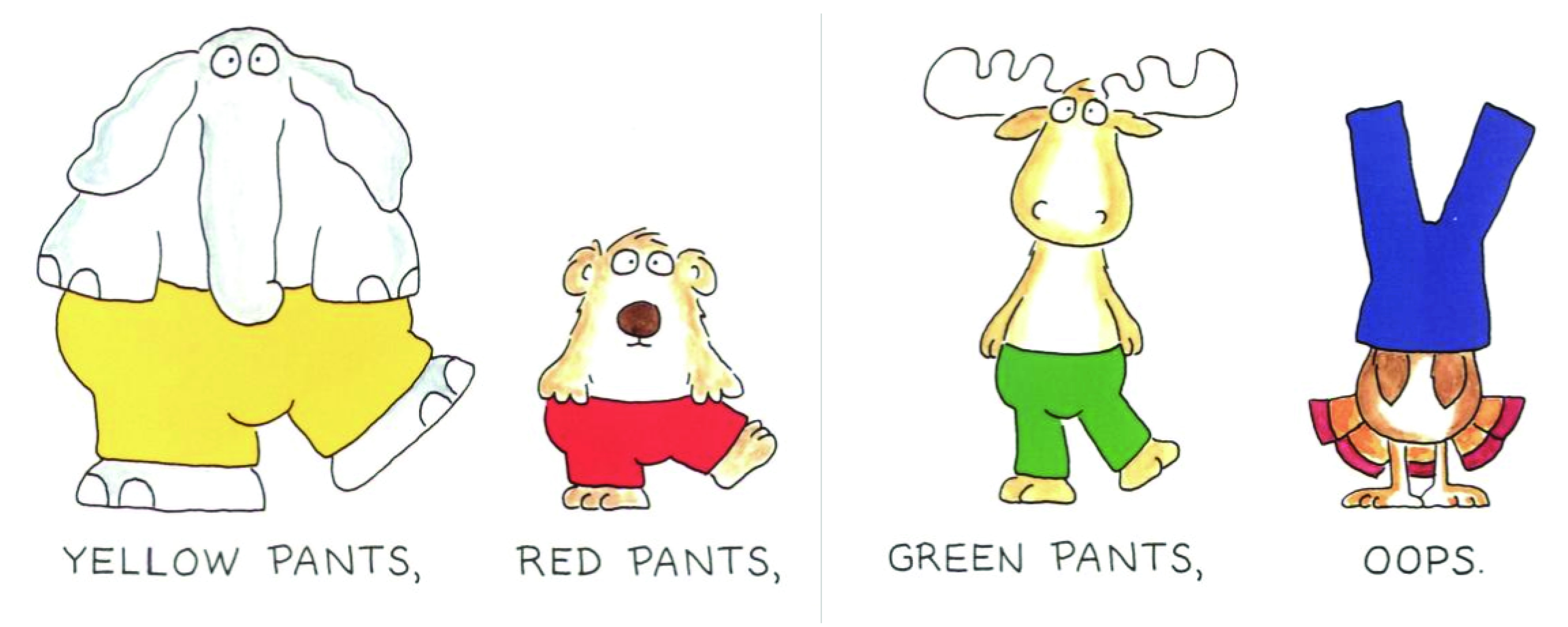 The laughs in this book don't just come from Boynton's iconic funny illustrations, but also from the simple writing, which heavily relies on repetition, page after page, of the word "oops": "Blue Pants, / Green Pants, / Red Pants, / Oops." I always exaggerate the OOPS! and earn big laughs from my kids who have caught on that this is a funny word for when something funny happens. Harry scripts some version of the many things I have said to explain the joke, like, "Silly turkey, that's not how to wear pants! Pants go on your legs, not on your head!"