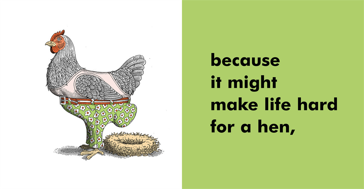 Each spread is a different example of why animals should definitely not wear clothing. The running gag is that the animals can't functionally wear the clothes (or it is unnecessary for them to do so) because of something intrinsic to the anatomy of the animal or some attribute of the animal or its behavior. In other words, it's not enough to know what pants are and to be able to tact them, or what a chicken is, or what an egg is, you have to understand that if a chicken is wearing pants, it can't lay an egg.