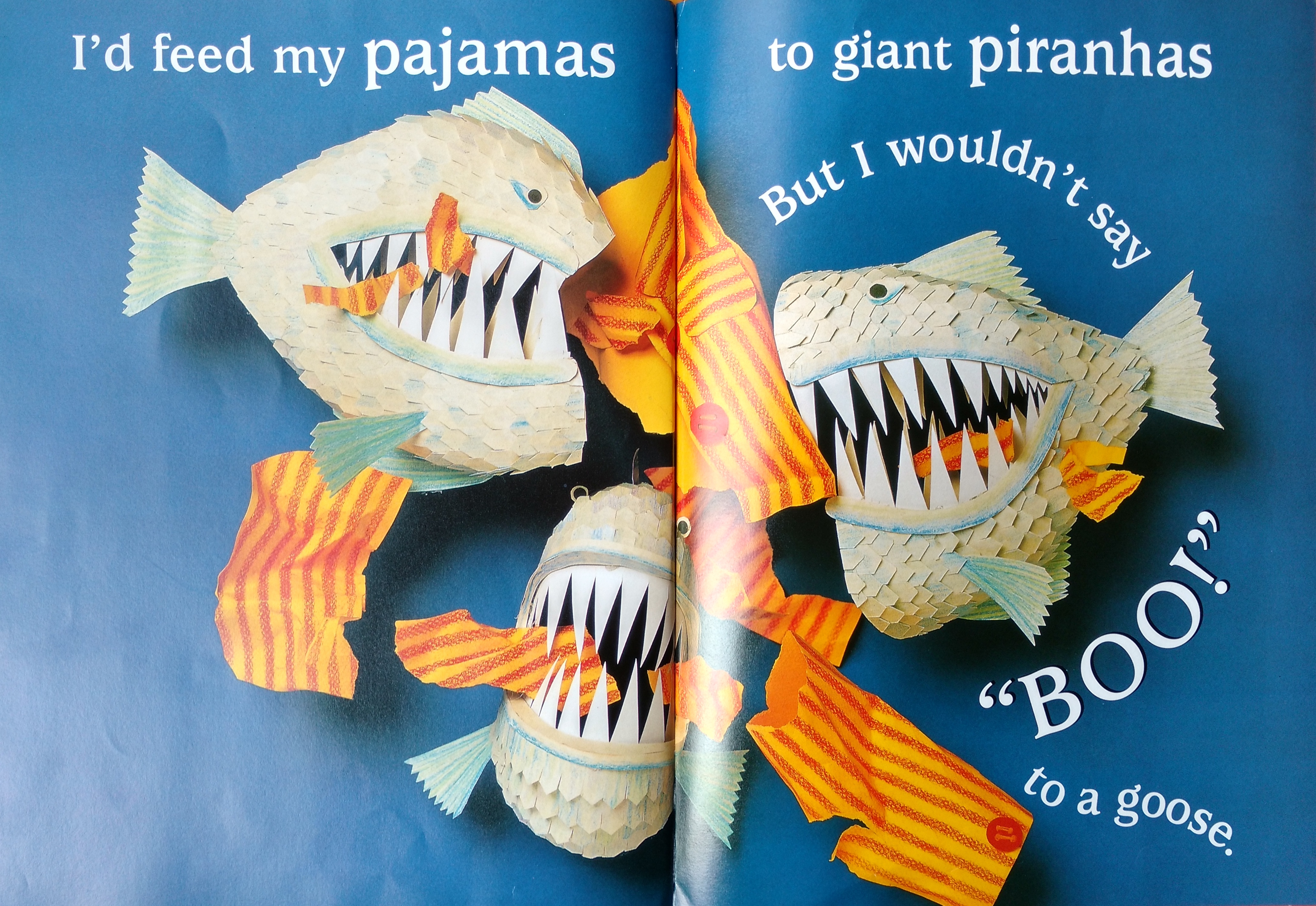 A word of caution: this book takes some forethought to read. Take for example, "I'd take a long walk / from here to New York / But I wouldn't say / "BOO!" to a goose." This is an example of a spread in which what's funny is in how the text is read--the act of making the word "walk" rhyme with "York."