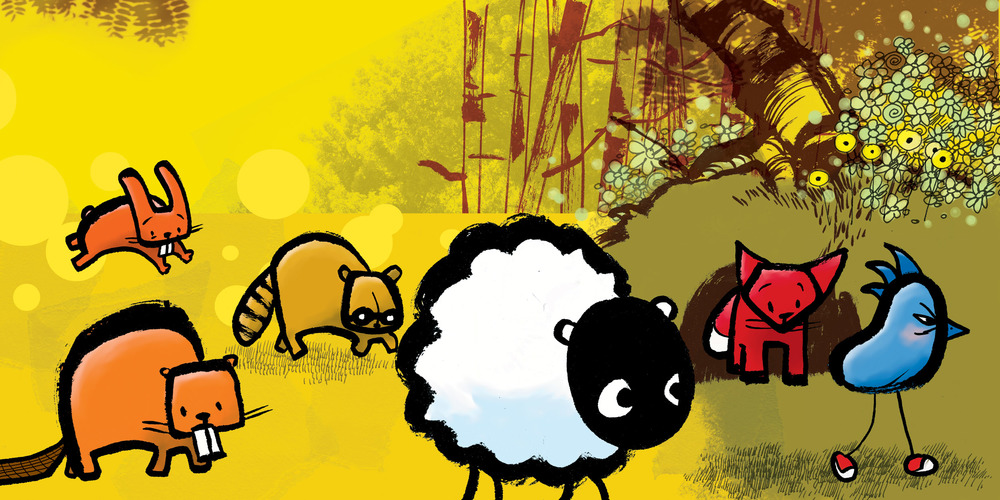 Grumpy Bird is the first in a series starring Bird and his woodland friends: Beaver, Fox, Sheep, Rabbit, and Raccoon. The first book deals with Bird being grumpy. The second, Boo-Hoo Bird revolves around Bird being upset after getting bonked on his head. And the most recent, released earlier this year, Hungry Bird is about Bird being very hungry.